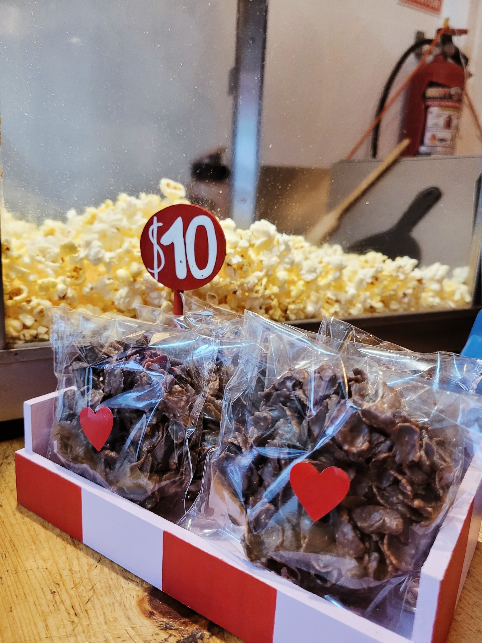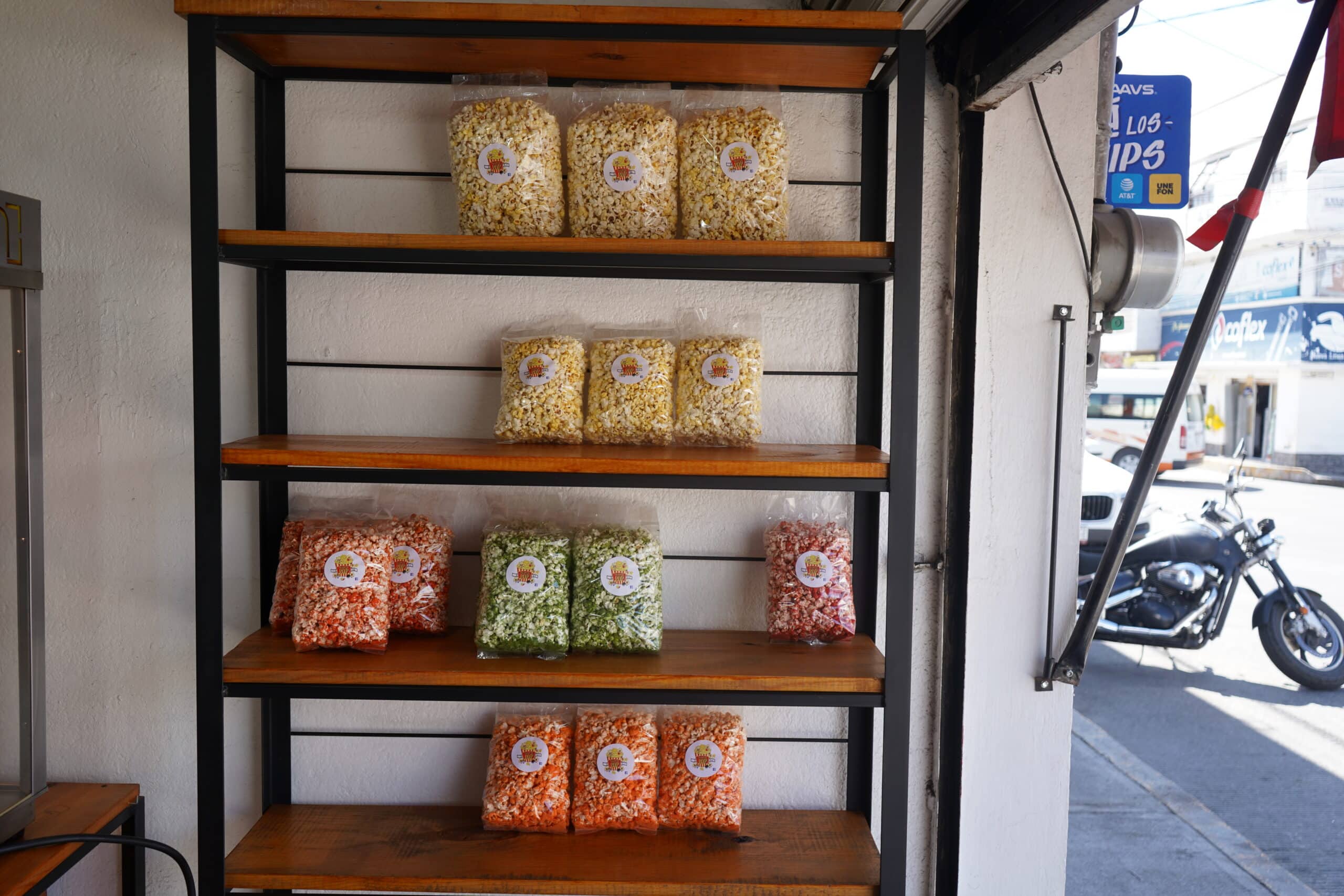 Ofrecen palomitas acarameladas, de queso, chile, chocolate, y combinaciones especiales como fresa con mora azul. Además, cuentan con el delicioso Ejambre, una mezcla irresistible de cereal cubierto con chocolate que se ha convertido en uno de los favoritos.